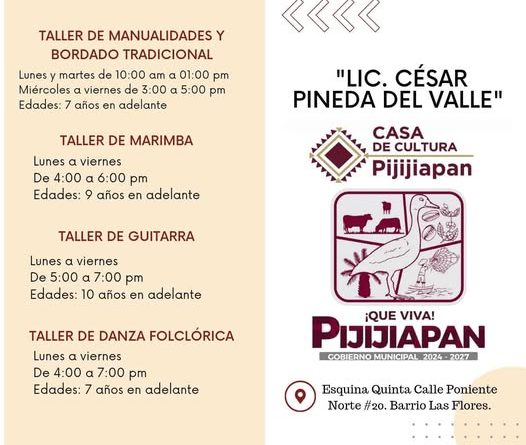 Únete a nosotros de lunes a viernes en la casa de la cultura municipal y explora nuestras clases gratuitas de guitarra, danza folclórica, marimba, manualidades y bordado tradicional.