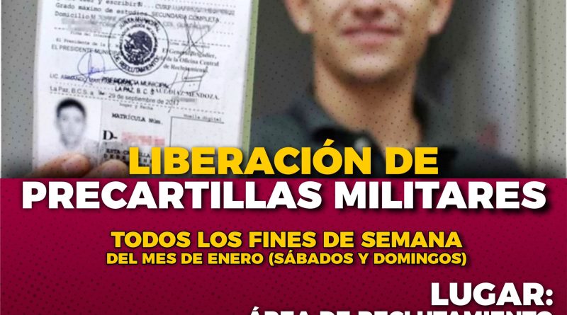Con la finalidad de recibir la documentación de aquellos jóvenes mayores de 18 años que quieran obtener su cartilla militar, deberá asistir al área de reclutamiento del municipio de Mapastepec, el proceso de solicitud se llevara a cabo todos los fines de semana del mes de enero (sábados o domingos), de 9:00 am a 12:00 pm.