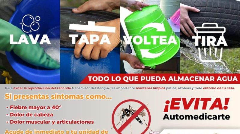 Recuerda: Lava, Tapa, Voltea y Tira todo lo que pueda almacenar agua para evitar la reproducción del mosquito