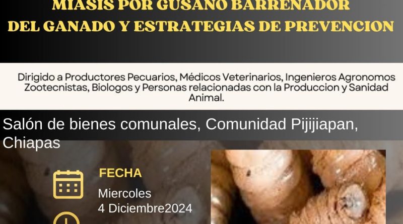 Bienes Comunales Comunidad Pijijiapan en coordinación con Senasica, CPA, Asociación Ganadera Local General Impulsores Ganaderos, Asociación Ganadera Local, Asociación Ganadera Local General Social, Unión de Productores Agropecuarios y Productores Regenerativos; Invitan a todos los productores pecuarios, Médicos Veterinarios, Ingenieros Agrónomos, Zootecnistas, Biólogos y personas relacionadas con la producción y sanidad animal, al taller de «Miásis por gusano barrenador del ganado y estrategias de prevención», que será impartido por el MVZ Arturo Lárraga Guillén, Jefe de Operaciones de Campo de la CPA, que se llevará a cabo este miércoles 4 de diciembre a las 4 PM en el salón de Bienes Comunales Pijijiapan.